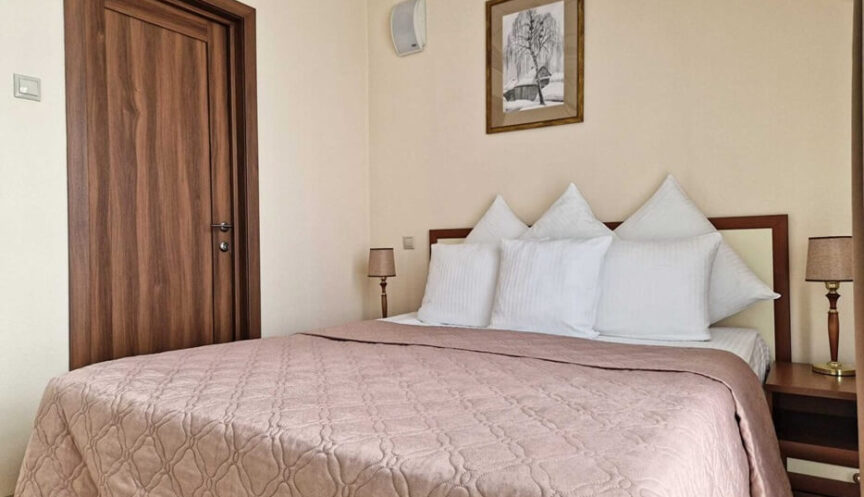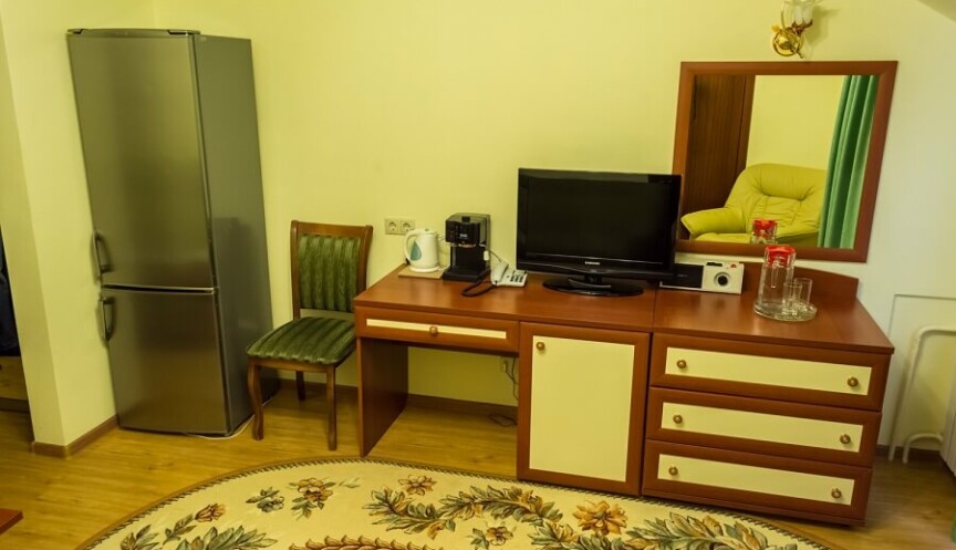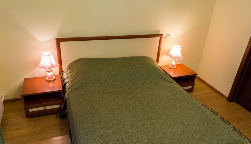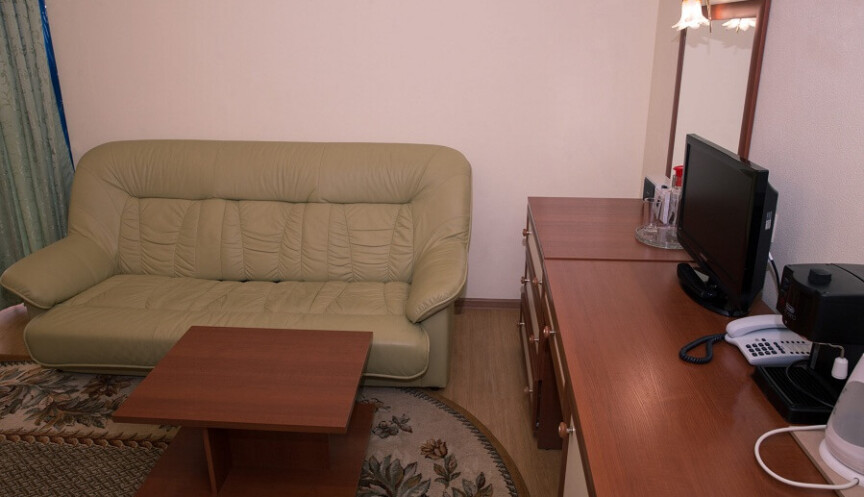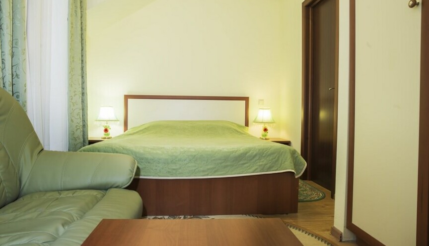 Двухместный однокомнатный номер с двуспальной кроватью и балконом, санузел с ванной, телевизор, холодильник, телефон, система охлаждения в летний период, фен, халаты, тапочки.