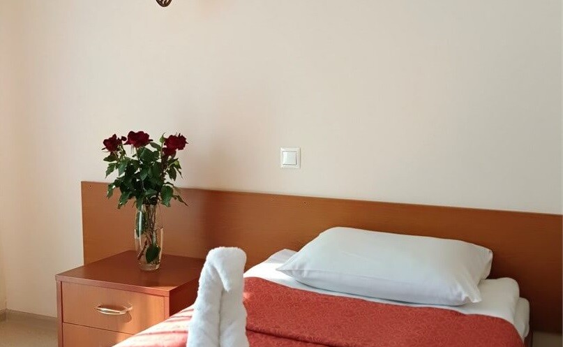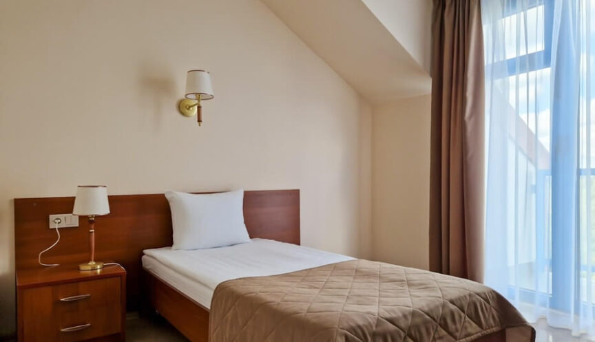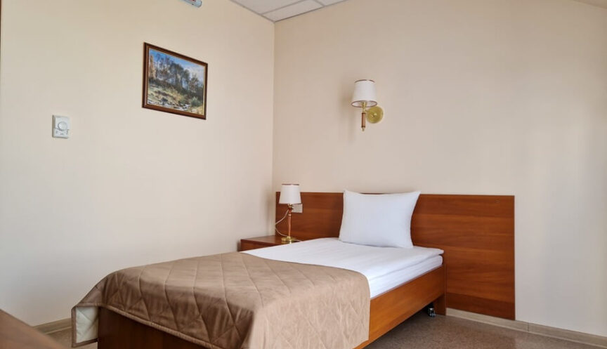 Одноместный однокомнатный номер с одной односпальной кроватью и балконом. (Наличие балкона не во всех номерах)